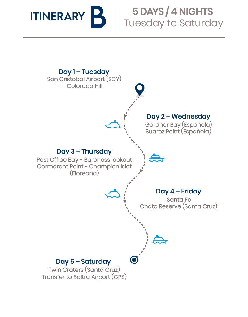 Our classic 4-night route to the southeast Galapagos Islands anchors at the most paradisiacal bays and lovely beaches. Some of these oldest islands are true crown jewels where you can become an eye-witness of evolution. Several (sub) species have had enough time to transform into emblematic figureheads, which differ from island to island. Moreover, the open water passages take 4-6 hours instead of long overnight navigations; our stable catamaran mostly floats at sheltered anchorages, which helps you get a restful sleep.